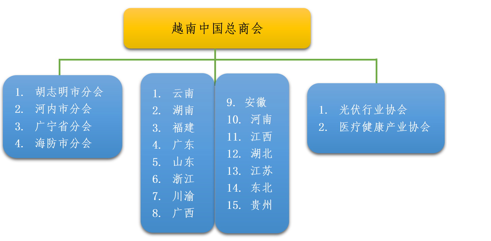 经过总会理事会批准,在条件具备的地区依据越南的法律和总会章程成立分会,依据越南的法律和分会的章程备案,在中国驻越南使(领)馆的指导下,在总会的领导下开展工作。规模在50家以上企业或机构会员的才能成立。