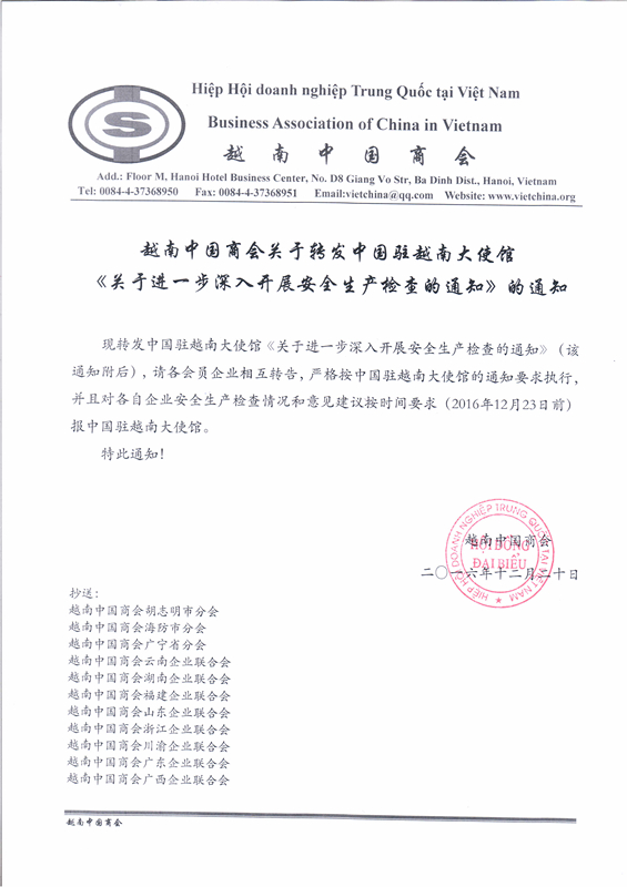越南中国商会关于转发中国驻越南大使馆《关于进一步深入开展安全生产检查的通知》的通知
