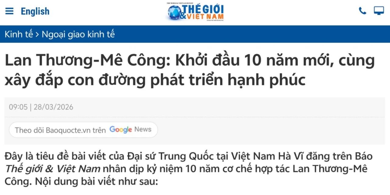 在澜湄合作首次领导人会议召开十周年之际,何炜大使在越南《世界与越南报》发表署名文章《澜湄十年新起步,共筑发展幸福路》,全文如下: