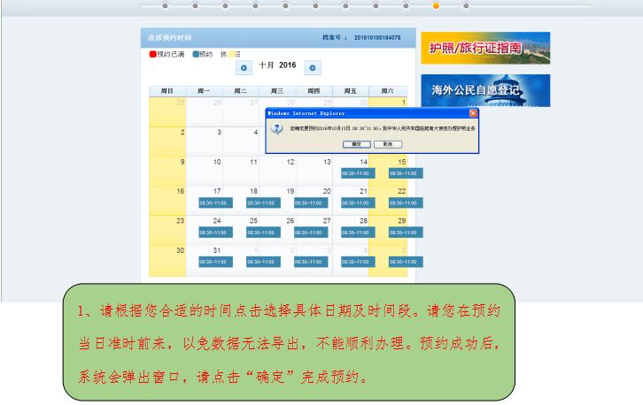 提醒:如预约后因突发状况等原因无法如约前往使馆,则可以通过系统再次预约。首次预约时您在系统中录入的个人资料及信息,系统将为您暂存3个月。在此期间,您可通过个人预约档案编号及验证答案随时将个人资料调出并修改,省去了重复填写资料的麻烦。